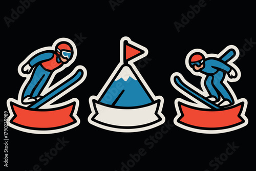 Stylized winter sports icons: ski jumping and mountain with bold colors