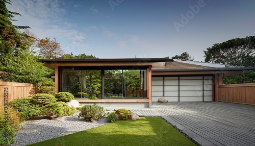 suburban contemporary home with an all glass back wall providing a seamless view into a minimalist japanese garden