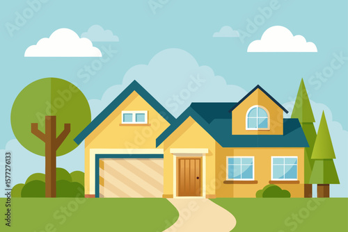 Suburban Cottage Residential House with Garage View