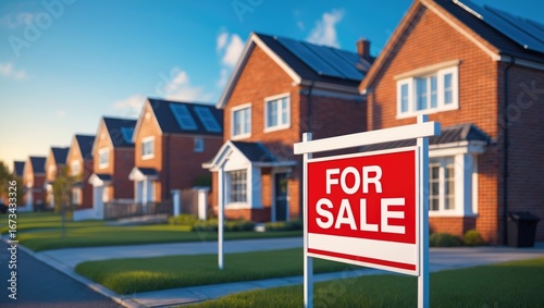 Suburban houses with a "For Sale" sign in the front yard. Residential neighborhood, real estate, property for sale, housing market, and community. The concept of real estate and housing market.