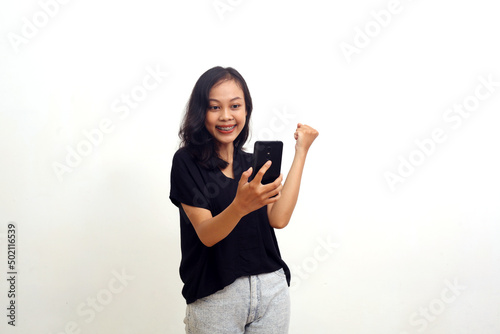 joyful, asian, indonesian, indian, young, woman, girl, female, teenage, college, student, standing, holding, cellular, mobile phone, mobile, phone, hand, smartphone, good, news, concept, isolated, white, background, copy space, fist, clenched, positive, mood, expression, attractive, smile, excited, carrying, application, device, contraption, modern, pose, looking, camera, promotion, advertisement, confidence, cyberspace, solution, sale