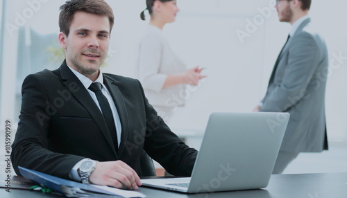 successful businessman sitting behind a Desk with an open laptop