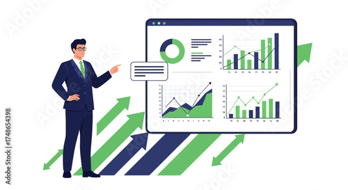 Successful Businessperson Presenting Financial Data and Growth on Digital Display