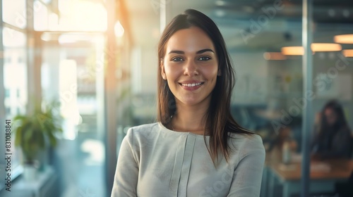 Successful businesswoman standing in creative office and looking at camera Woman entrepreneur in a coworking space smiling Portrait of beautiful business woman standing in front of bus : Generative AI
