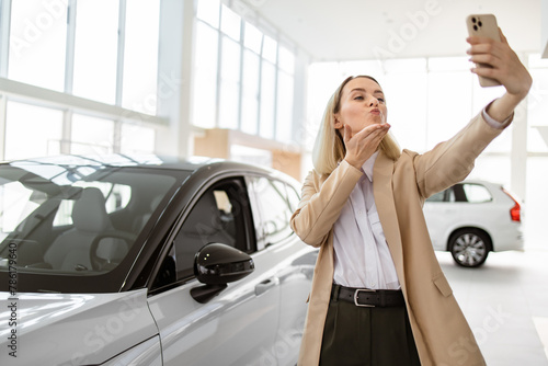 Successful businesswoman taking selfie using smartphone in car service. Happy smiling Caucasian girl buyer talking online about buying a new car.