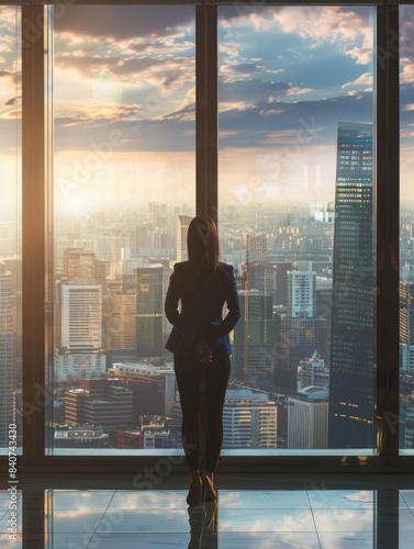 Successful confident businesswoman is standing by the full-wall window and looking out the window, behind the window below is a big business city hyper realistic