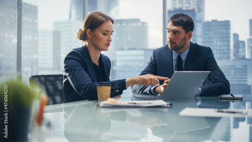 Successful Corporate CEO and Investment Manager Talking, Using Laptop Computer while Sitting in Meeting Room in Office. Two Successful Businesspeople Brainstorm on e-Commerce Marketing Project.
