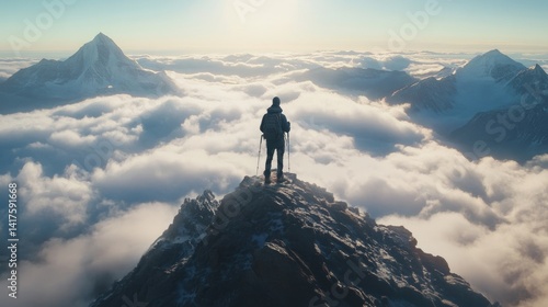 Successful hiker enjoying the view atop a mountain above the clouds