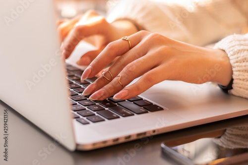 Successful manager working in cafe during break and searching information in internet on his notebook computer, Female hands using laptop in modern coffee shop or loft