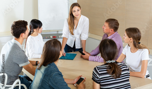 Successful young woman sharing business ideas with colleagues in meeting room. Concept of teamwork