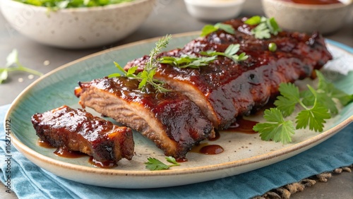 Succulent barbecue ribs glistening with rich glaze served on a rustic plate with fresh herbs and vibrant sides