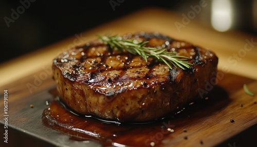Succulent grilled steak with a perfect sear, garnished with rosemary, served on a rustic wooden board, showcasing rich marbling and mouthwatering glaze.