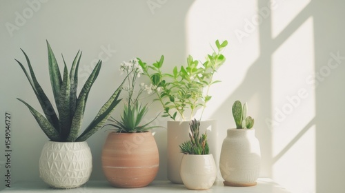 Succulent plant collection in decorative ceramic pots minimalist interior decor setup with neutral pastel tones