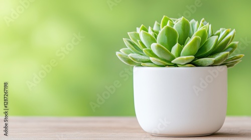 Succulent plant in pot, wooden table, blurred green background, home decor