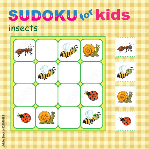 Sudoku for kids with various insects. Ant, snail, bee and ladybug. Seamless pattern as a background.