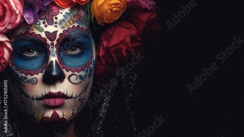 Sugar Skull Makeup for Halloween or Dia de los Muertos Celebration, Creative Artistic Face Paint Banner with Copy Space, Festive Cultural Holiday Concept