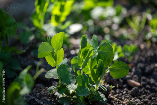 Sugar snap peas, growing in a garden in the countryside, fresh seedlings have grown.