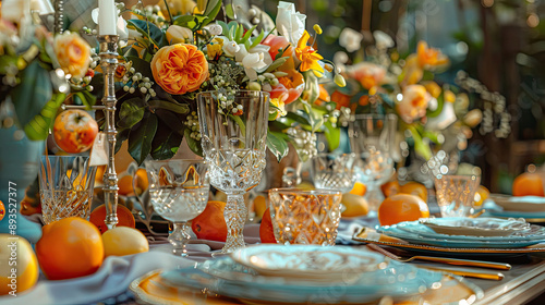summer crystal glass ,gold dishes and gobbles wedding party table set up, gold, light, tree, white and orange flowers ,xmas lights on chandelier, decorations new year sit down afternoon party