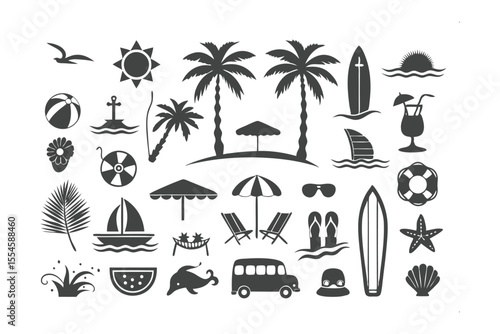 Summer Beach Icon Set: A comprehensive collection of summer beach icons, including palm trees, beach umbrellas, surfboards, cocktails, and more, perfect for travel, vacation.