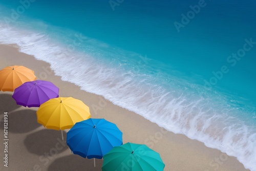 summer, beach, scene, colourful, umbrella, crystal, wave, sand, ocean, shore, vacation, holiday, travel, tropical, sunny, bright, vibrant, relaxing, fun, leisure, water, blue, sky, paradise, escape, refreshment, play, family, friends, activity, coastline, scenic