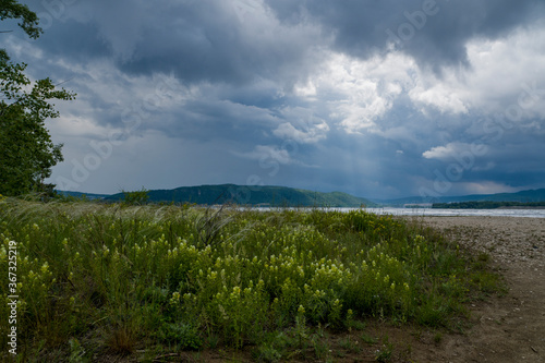 summer, cloudy, day, walk, sky, clouds, space, distance, height, nature, landscape, forest, mountains, coast, river, water, light, shadow, observation, beauty, sun, rays, meadow, grass, flowers