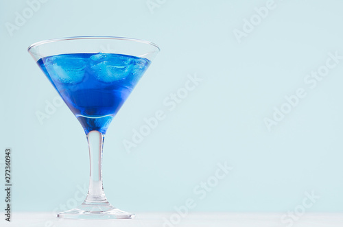Summer cold blue lagoon drink with ice cubes in elegant martini glass on pastel mint background.