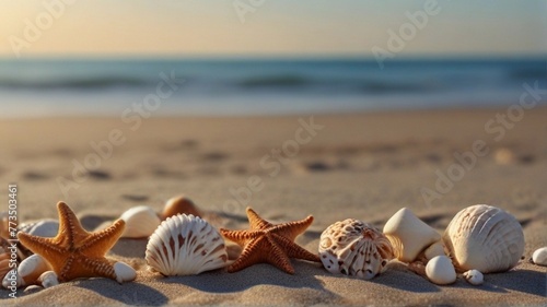 Summer concept with sandy beach, shells and starfish lapping by calm ocean waves. Seashells are lying on the wavy sand of the seabed. Sea waves the beach.