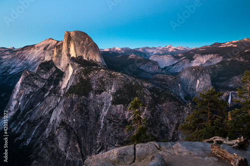 summer dusk in Glacier Point in Yosemite National Park. The Half Dome can be seen in this elevated vantage point.