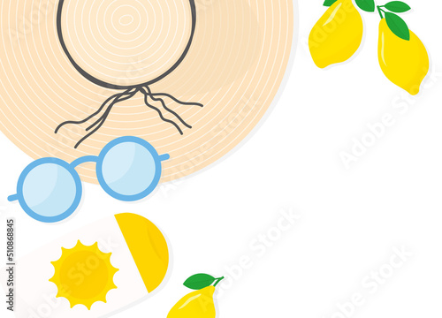 summer flat lay banner with straw hat, sun cream, lemons, and sunglasses with copy space- vector illustration