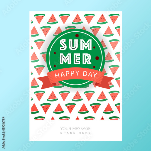 Summer holiday greeting card typography with tropical palms and watermelon slices, Vector illustration
