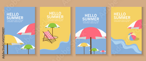 Summer holiday on sea and sand beach poster banner design, hello summer Minimalist background with palm leaves cards balls, umbrella, fun concept design for sale, post template.