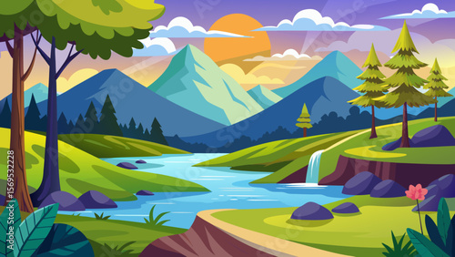 landscape, mountain, sky, nature, vector, summer, illustration, grass, mountain, green, hill, tree, forest, cloud, meadow, field, cloud, spring, river, sun, cartoon, hill, view, blue, lake