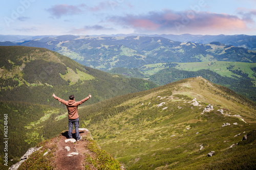 Summer mountain landscape with man standing on the rocky hill