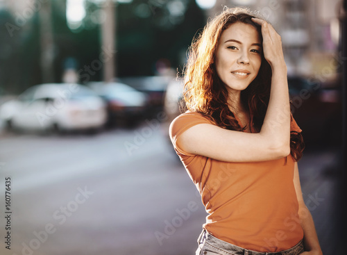 Summer outdoor porttrait of young pretty girl posing at sunset in city