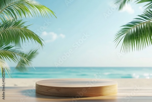 Summer product display on wooden podium at sea tropical beach with generative ai
