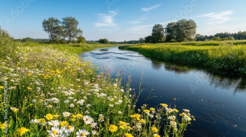 Summer river wildflowers idyllic landscape, tranquil scene, nature background, travel brochure