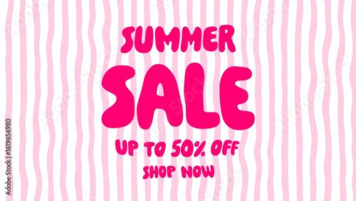 "Summer Sale up to 50% off Shop Now" Pink Text on Light Pink Vertical Striped Background Promotion Horizontal Banner - video also available