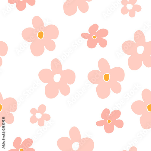 Summer seamless pattern with pink flowers. Floral cartoon printing.