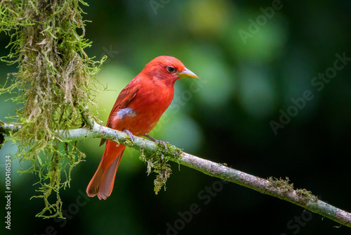 perched, tree branch, moss, plant, rainforest, bird, jungle, mossy, forest, tropics, front view, full body, nobody, 1, songbird, costa rica, full-length, no people, tree, wild animal, central america, horizontal, wildlife, tropical, color image, colourful, red, colourful, vibrant, saturated, bright, colours, colours