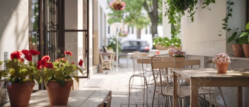 summer, terrace, cafes, glasses, metal, table, chair, flower, pot, window, seating, dining, eatery, bistro, urban, contemporary, design, modern, chic, stylish, elegant, cosy, ambience, sunny, leisure, relaxation, city, sidewalk, european, street, quaint, charming, decor, floral, arrangement, window sill, inviting, atmosphere, fresh, greenery, plant, sunlight, cheerful, vibrant, lively
