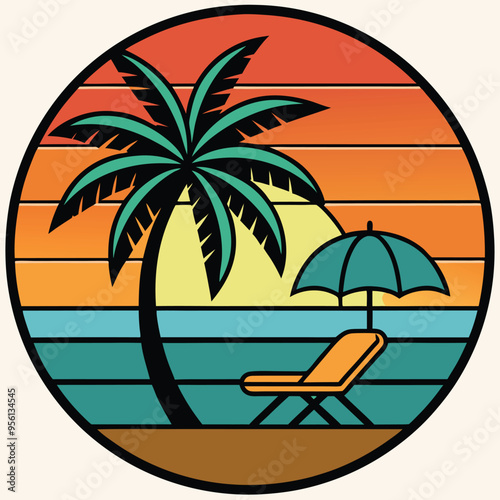 beach, palm, tree, island, sea, summer, tropical, vector, sun, ocean, water, travel, illustration, nature, landscape, holiday, vacation, sand, sunset, sky, paradise, coconut, silhouette, exotic, icon