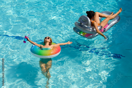Summer woman friends on holiday vacation. Luxury girl in swimming pool.