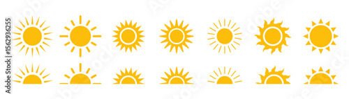 sun, sunshine, vector, icon, sunlight, summer, yellow, design, weather, light, graphic, heat, set, silhouette, circle, flat, hot, rise, logotype, abstract, shine, solar, collection, warm, beam, nature, sunburst, sunset, white, isolated, ray, element, shape, signs