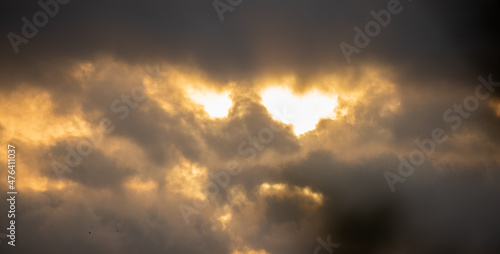 Sun is shining through stormy clouds and it looks like a face.