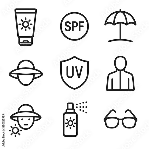 Sun Protection Icons. Outline icon set of sun protection: sunscreen tube, SPF icon, umbrella shade, wide-brim hat, UV shield,