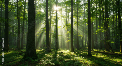Sun rays through trees in a green forest nature scene with light and shadows for an outdoor adventure