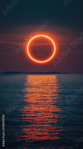 Sun rising through a giant ring above a calm sea, minimal line details, pastel sunrise