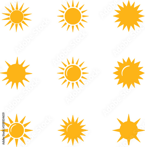 Sun vector set of six in yellow color on white background. Sun simple icons collection. Yellow sun icon set, sunshine and solar glow, sunrise or sunset. Vector illustration.