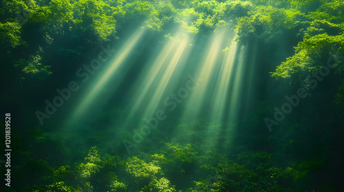 Sunbeams filtering through lush green forest canopy, creating a mystical and serene atmosphere