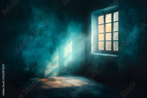 Sunbeams illuminate a dark, textured room, creating a dramatic contrast through a window. The teal walls and hazy light evoke a sense of mystery and intrigue.